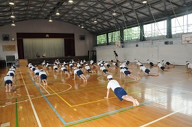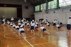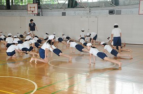 組み体操の技を6年生が5年生に教えています。
