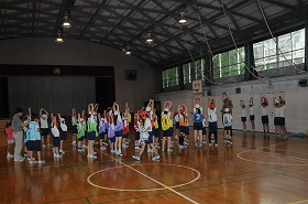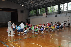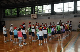 1年生のシャトルランを6年生が手助けしています。1年生と6年生がいっしょに準備運動をしています。