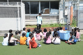 野菜を育てるための畑を準備しています。ダンゴムシや菜の花の種を見つけた子もいます。