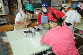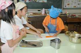 「ゆで野菜サラダ」を作る実習です。ゆでる野菜を切っています。