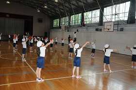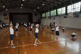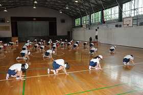 表現運動のまとめとして、音楽に合わせて体を動かしています。