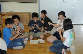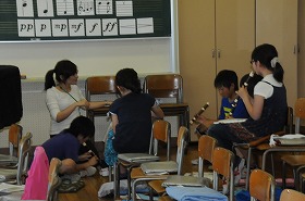 短調の響きを感じ取りながら、グループごとにリコーダーの演奏をしています。