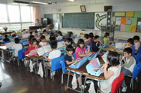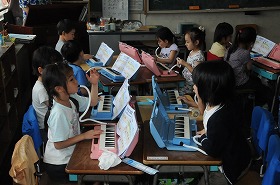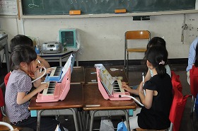 ドとレの音を使った「あそぼ」の曲を、鍵盤ハーモニカで練習しています。隣同士で聞き合って、上手に演奏できたら○のサインを出します。