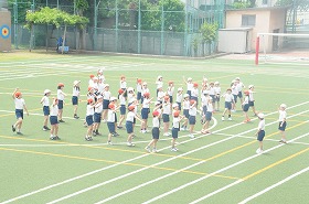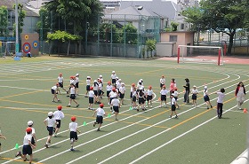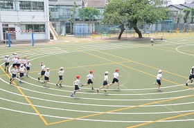 運動会の表現運動の練習をします。まず準備運動のあと、トラックに沿って走っています。