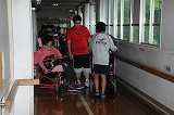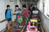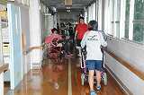運動会の入場行進でわかたけ学級の子どもたちの車いすを押す子どもたちが、わかたけ学級の子どもたちと交流した後で車いすを押す練習をしています。
