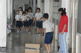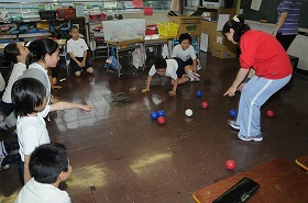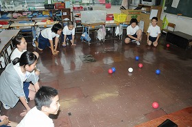テニスラケットとボールを使った室内ゴルフと、ボッチャというゲームをしています。