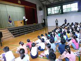 今日は、油面小学校の87回目の開校記念日です。開校87周年をお祝いするために集会を開き、校長が、油面小学校の歴史、校歌と校旗の由来などの話をしました。最後にみんなで校歌を歌いました。