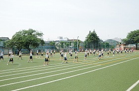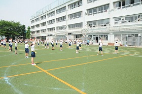 校庭で運動会の表現の練習をしています。