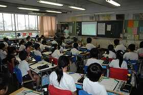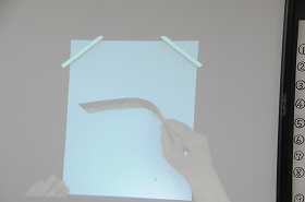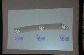 初めて筆を使って字を書いていきます。まず横画の書き方を確認しています。