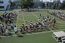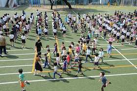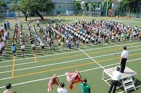 校長が「運動会の練習に集中力をもって取り組み、けがをしないこと」「熱中症を予防する」の話をしました。朝会終了後の行進がとても上手です。