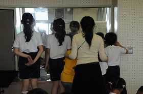 「かっこう」を歌うときの口の開け方を、鏡を見ながら確認しています。