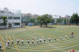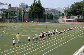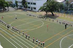 玉入れの練習をします。まず入場からはじめ、位置につきました。