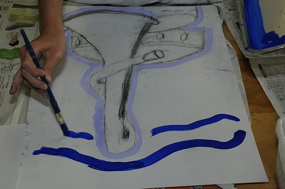 「音の鳴る絵」をテーマに、素描した楽器に色を付けています。