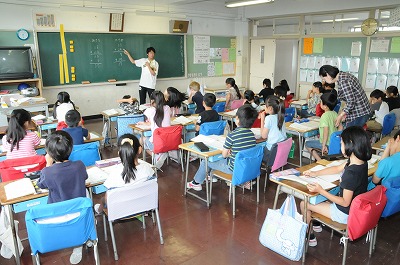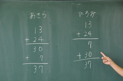 2つの筆算の仕方を比べ、どちらが正しいか考えています。