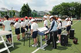6年生の代表児童が終わりの言葉を言い、全員で校歌を歌って運動会の閉会式の練習が終わりました。全員座席の位置に戻ります。