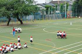 運動会の2年生の団体種目「大玉ころがし」の練習をしています。