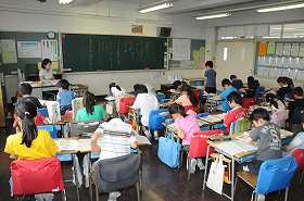 挿絵を見て、迷子の子どもを捜すアナウンスを考え、発表しています。