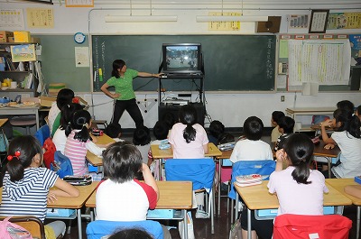 運動会の表現のビデオを見ながら、動きのチェックをしています。