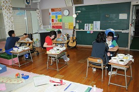 みんなで給食を食べています。