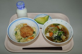 明日はいよいよ運動会です。そこで、給食室では皆さんを応援して「勝(カツ)丼」を作りました。 果物は旬のメロンです。栄養をしっかりとり、今日は早く寝て、明日がんばりましょう。