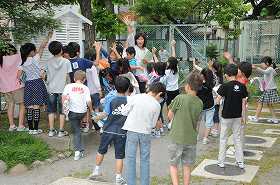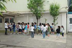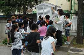 気温調べをする準備として、百葉箱について話を聞いています。