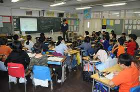 種子の発芽を観察するために、まず顕微鏡の使い方を確認しています。