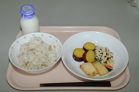 今日は、虫歯予防デーにちなんで、カミカミメニューです。いかや切り干し大根はかみごたえのある食材。しっかりかむと唾液がたくさん出て、歯のそうじをしてくれます。