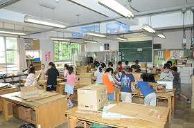 「だんだんだんボール」をテーマに、段ボールを工夫して使って形を作っています。