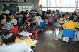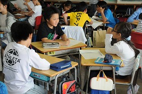 「きいて きいて きいてみよう」で、班ごとにインタビューをしています。
