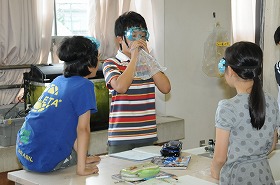 息を集めた袋に石灰水を入れて振っています。