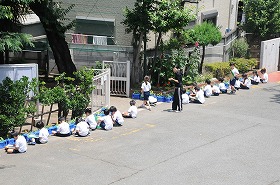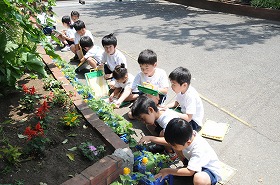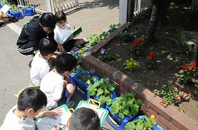 子どもたちが、育てている朝顔を観察しています。