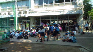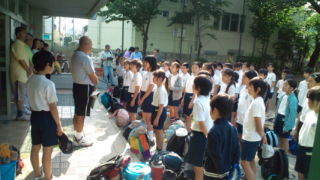 今日は東松山に田植えに行きます。定刻に子どもたちが学校に集まり、出発式を行っています。7:30