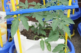 子どもたちが育てているトマトが大きくなっています。