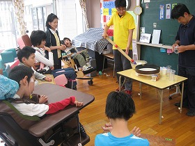 1組と2組合同のわかたけタイムで、ボールを使ったゲームをしています。