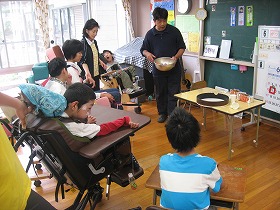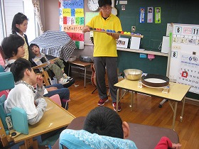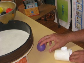 1組と2組合同のわかたけタイムで、ボールを使ったゲームをしています。