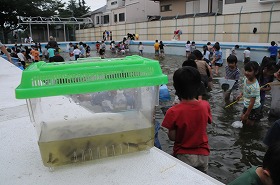 1・2年生が水を抜いたプールでやごとりをしています。