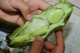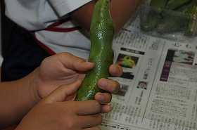 2年生がそら豆のさやむきをしています。