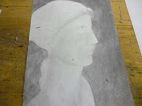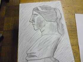 「色の濃淡で」をテーマに、友だちの顔を素描し、一色で濃淡を付けています。