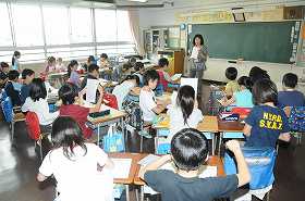 今年度の水泳カードを見て、内容を確認しています。