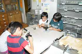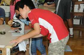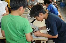 ビオトープの水でプレパラートを作り、顕微鏡で観察しています。
