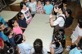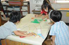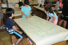 「分身さん」をテーマに、体全体を大きな紙に写しとり、どんな服にするのか、どんな表情にするのかを班のみんなで考え、表現しています。