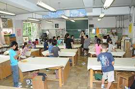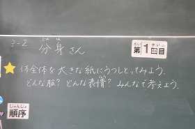 「分身さん」をテーマに、体全体を大きな紙に写しとり、どんな服にするのか、どんな表情にするのかをみんなで考え、表現しています。