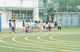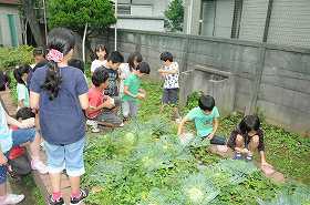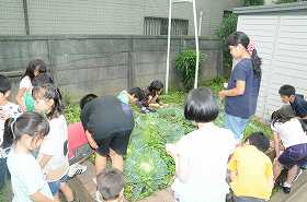畑のキャベツの所で、モンシロチョウの観察をしています。