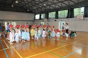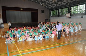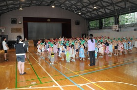 バディーによる人数確認の練習をしています。まず2年生がお手本を見せた後で全体で練習しています。
