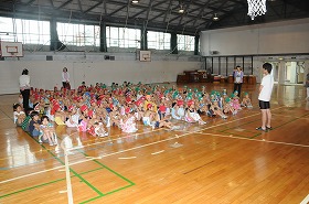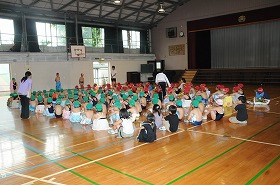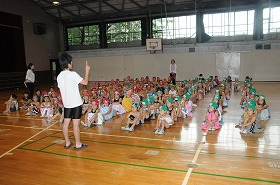 子どもの代表がめあてを発表した後で、プールでの約束を確認しています。