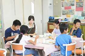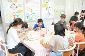 5年2組の子どもたちがランチルームで給食を食べています。各クラスごとに年間2回ずつ行う予定です。