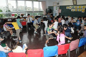 カードを使い、英語でフルーツバスケットのようなゲームをしています。