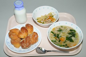 今日の主食はあげぱんです。みなさんには、きなこ・ごま・シナモンから一つ選んでもらいました。サラダにはじゃがいもを千切りにして入れました。シャキシャキの食感がおいしいです。※あげパンの一番人気はきなこでした。