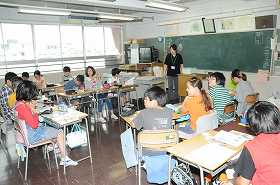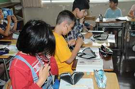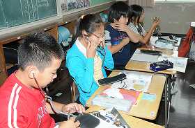 心臓のはたらきを知るために、聴診器で自分の心臓の音を聞いています。