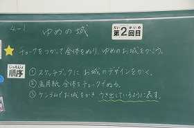 「ゆめの城」をテーマに、チョークを使って全体を塗り、ゆめのお城を描いていきます。